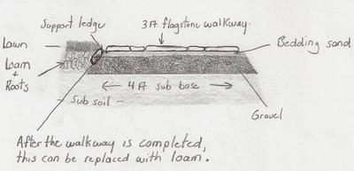 If your walkway surface is 3 ft. wide, the base the stones are going to lay on should be 3ft. 6 inches. (3 ft. for the walkway stones, and 3 inches of support ledge on either side.)