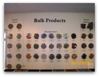 Display wall of decorative rock and gravel products.